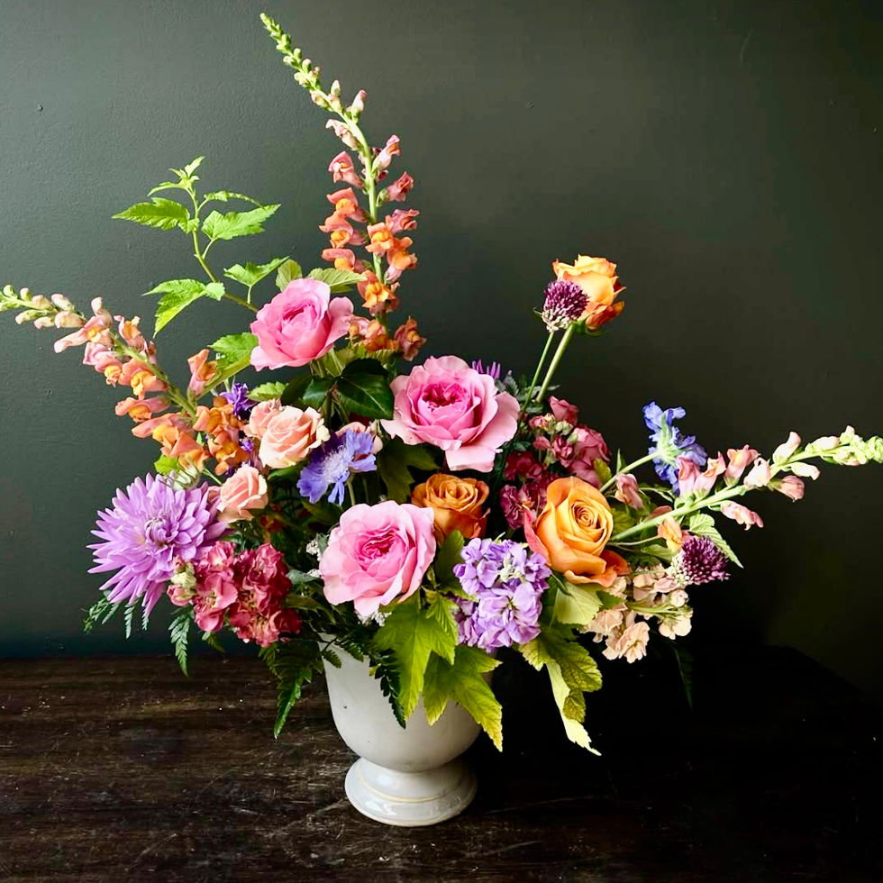A pedestal filled with Snap Dragons, Mums, Roses.
