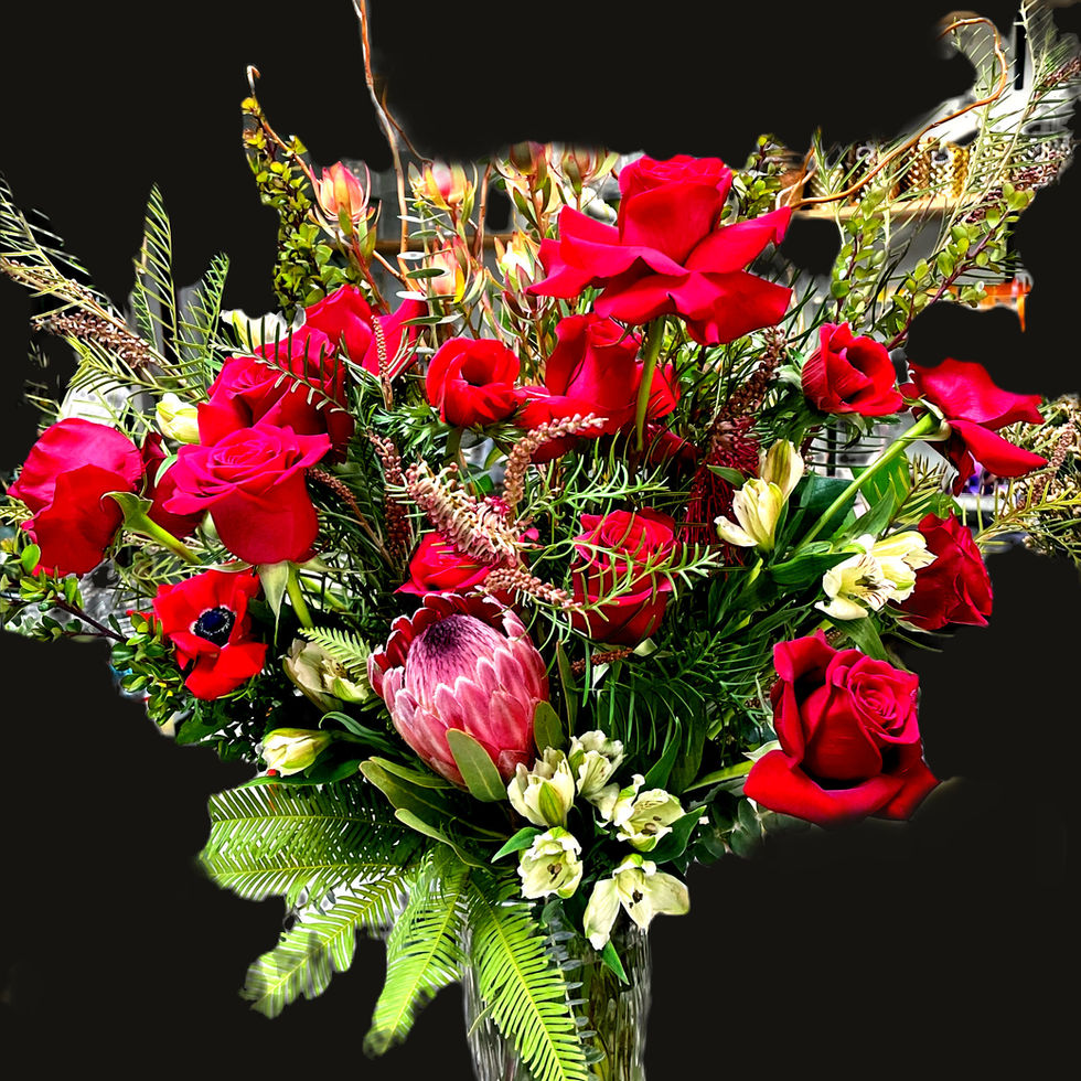 Spectacular large floral arrangement. A dozen red roses accented with a variety of protea, red poppies and accent flowers.